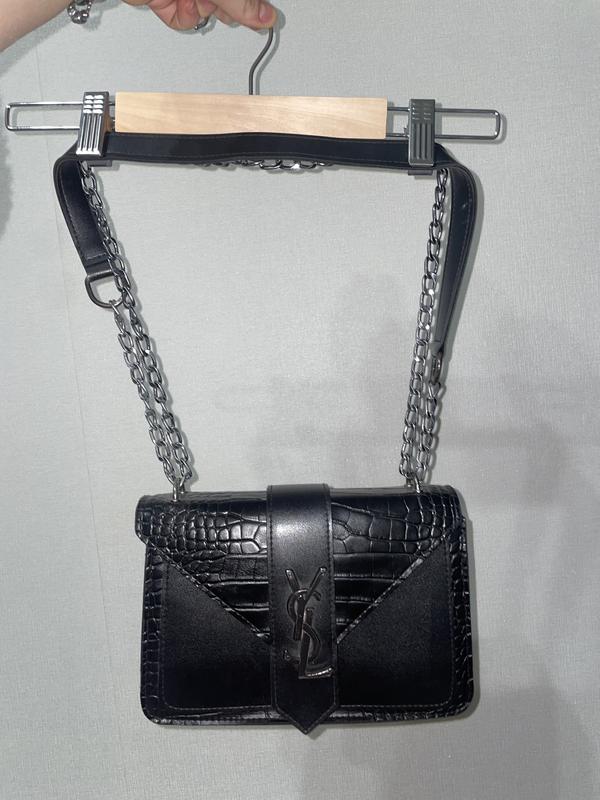 Сумка жіноча чорна на ланцюжку. Стильна та компактна модель з тисненням під крокодила. Жорстка форма, акуратна фурнітура сріблястого кольору. Довгий ланцюжок дозволяє носити сумку через плече або на плечі. Закривається на клапан, добре тримає форму. Стан дуже гарний, без помітних дефектів. Ідеально підходить як для повсякденних образів, так і для виходів.