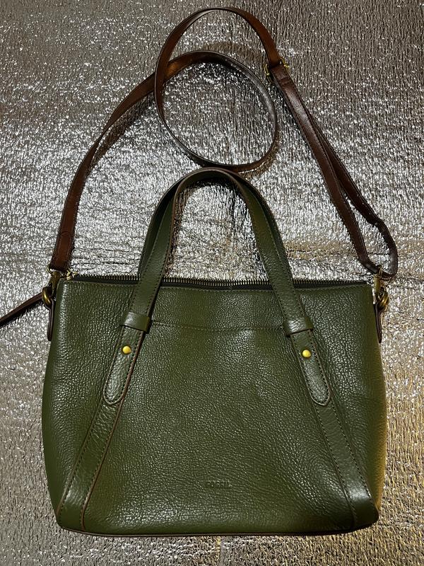 Сумка шкіряна жіноча Fossil Характерні особливості цієї моделі: • Дизайн: Класична форма саквояжа (satchel) з двома короткими ручками та довгим знімним ремінцем через плече. • Матеріал: Зерниста натуральна шкіра темно-зеленого кольору (часто цей відтінок у Fossil називається Olive або Spruce). • Деталі: Тонкі шкіряні смужки, що йдуть від ручок донизу і закріплені латунними заклепками. • Кишені: Ззовні є непомітна накладна кишеня спереду (між ручками). • Фурнітура: Латунного кольору (Antique Brass), що є візитівкою бренду. Верх 31 Низ 25 Висота 22 Дно 25/8 Довжина паска 130