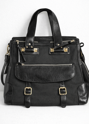 Продаю оригинальную сумку Chloé, модель Alice - стильное сочетание прочного текстиля и натуральной кожи. Сумка для тех, кто ценит премиальное качество и узнаваемый дизайн бренда. Характеристики: Материалы: Прочный черный текстиль (основа) и вставки из натуральной гладкой кожи (ручки, углы, детали). Фурнитура: Оригинальная, массивная, в фирменном золотистом цвете. Особенность: Внутренние бирки были срезаны для удобства использования, учтены в цене. Оригинальность подтверждается качеством кожи, гравированием на фурнитуре и соответствием модели. Состояние: Очень красивое, текстиль без пятен, кожаные детали ухоженные. Стиль: Большая, вместительная сумка, которая держит форму. На последних фото – скроны с ценами на данную модель в ресейле ($350). Из-за отсутствия броков пишу по суперцене!размер 30×38 ширина дна 12. вместительность