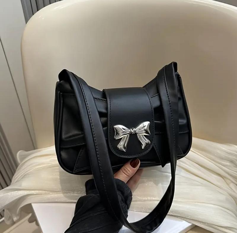 Стильна жіноча сумка чорного кольору з декоративним металевим бантом. Виготовлена з якісної екошкіри, виглядає елегантно. Зручний ремінець дозволяє носити сумку через плече або на плечі. Ідеально підходить як для щоденного використання, так і для особливих виходів.