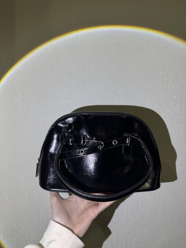 ✨ Елегантна лакована сумочка-купол у стилі Y2K/Modern Classic ✨ 💎 Сяючий ефект: Глянцеве лаковане покриття з легкою текстурою «жатки» ⛓ Стильні деталі: Передня частина прикрашена декоративним ремінцем із люверсами та карабіном. 👜 Зручність та функціональність: Має дві міцні короткі ручки для носіння в руках або на лікті. У комплекті йде довгий регульований ремінець, щоб носити через плече (crossbody). На дні є металеві ніжки, які захищають сумку від зносу та забруднень. внутрішній простір: Всередині підкладка в смугастий принт 🥨. Досить містка для свого розміру: телефон, гаманець, косметика та ключі помістяться без проблем! Характеристики: Колір: Глибокий чорний (глянець) 🖤 Фурнітура: Срібляста⚙️ Стан: подарували на таємного санту, але на жаль трохи мені не підійшла( Форма: Жорстка, чудово тримає форму, навіть якщо порожня. 📐 Заміри (приблизні): Глубина по дну: 9 см Ширина по дну: 24 см Висота: 15 см Довжина великої ручки: 120 см 🚀 Доставка та оплата: Відправляю Новою Поштою 📦. Можлива безпечна оплата через Шафу або накладений платіж за передоплатою за доставку. 📩 Пишіть у приватні повідомлення, відповім на всі питання та зроблю додаткові фото