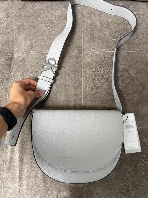 Сучасна містка сумка через плече зі структурованою формою. Регульований плечовий ремінь для індивідуального носіння. Прикрашена металевою пряжкою з монограмою та логотипом CK.