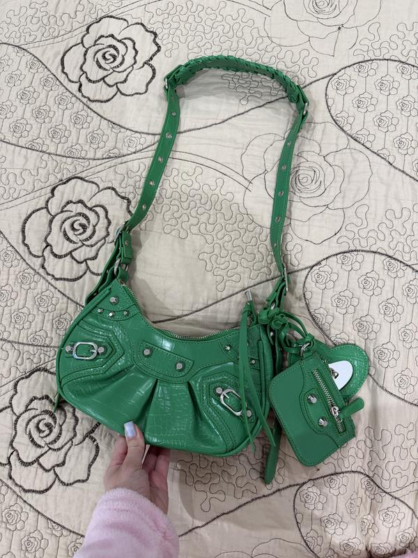 Сумка під бренд.В ідеальному стані, зеленого красивого кольору вся фурнітура ціла без пошкоджень. З недоліків тріснуло дзеркальце на брілочку, можна його зняти або замінити(вклеєти інше). Ремінець регулюється, можна носити через плече. Компактна але вмістка. Всередині також без дефектів.