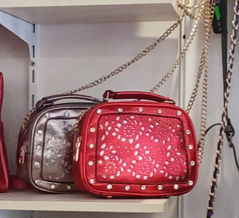 Маленька сумочка для молоді з екошкіри. Спереду перфорований малюнок, ззаду-гладка. Розміри-20*16*9см на довгому ремінці -ланцюжку, посередині ланцюжка(на плече) є частина ремінця з єкошкіри. В середині одне велике відділення, є бокові кишені. Ззаду є кишеня під блискавку. Зверху застібка на блискавці. В наявності у двох кольорах- червона та сріблясто-бузкова, фарба глянцева блискуча. Спереду інкрустація камінцями. Є маленька ручка зверху. Пересилаю після оплати на карту або безпечною оплатою.