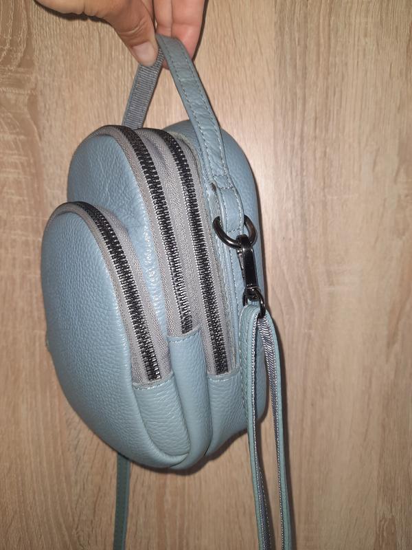 сумочка маленькая 19×11x9 см, помещается кошелек, телефон, очки, и мелочи, ключи в маленький карман. Стан идеален, но есть дефект потертости, это я упачкала в краску и оттерла (в глаза не бросается, потому что га самому дне, красивый голубой цвет, не яркий