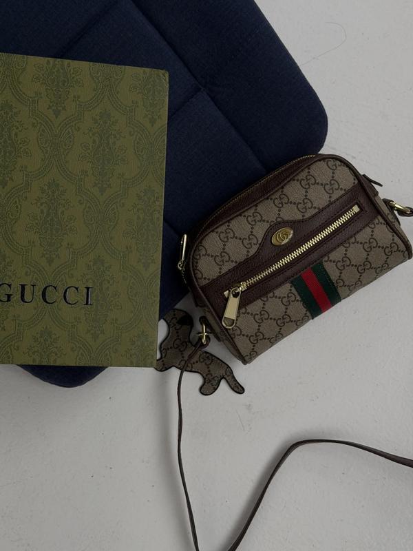 Сумка виготовлена зі шкіри Усередині — одне велике основне відділення та одна відкрита внутрішня кишеня. Також передбачен ланцюжок із карабіном для ключів. Має логотип із тисненням, бірку з QR-кодом та серійний номер Доповнена брелоком у вигляді собаки Фурнітура — металева, у золотистому кольорі, з брендованими елементами Матеріал: шкіра Розмір: 18 × 15 × 6,5 см Ремінець не відстібається, але регулюється. Максимальна довжина ремінця — 112 см Магнітна коробка пильник та документики✅