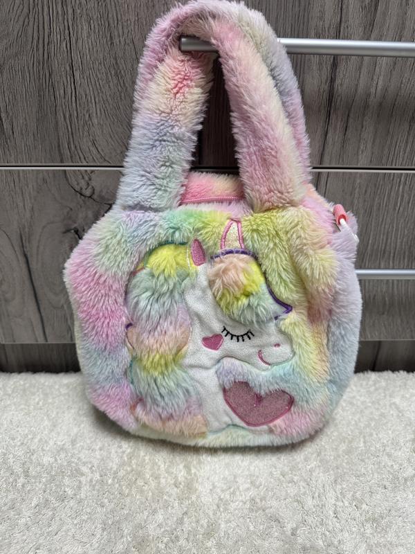 Мила та яскрава дитяча сумочка з м’якого плюшу з райдужним забарвленням. Прикрашена аплікацією у вигляді єдиноріжка та сердечок. Легка, приємна на дотик, зручна для прогулянок і зберігання дрібниць. Чудовий аксесуар для маленьких модниць.