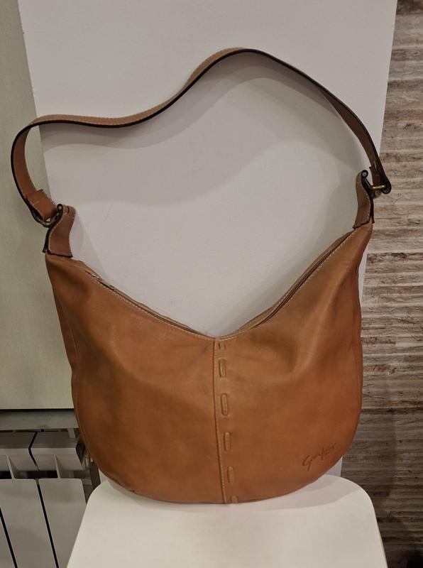 сумка из натуральной кожи рыжего цвета с закругленным дном на одной широкой ручке. Имеет два больших отделения на молниях с внутренними карманчиками. Достаточно большая и вместительная. Размер высота посередине 24см, ширина 42см,дно шириной 6см. Длина ручки 55см