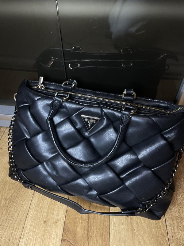 Оригінальна сумка GUESS Стильна чорна сумка з м’якої екошкіри з трендовою стьобаною текстурою. Має зручні короткі ручки та довгий ремінець на плече/через плече з ланцюжком. Закривається на блискавку. Усередині — містке відділення з фірмовою підкладкою GUESS, є внутрішні кишені на блискавці та для дрібниць. Нюанс: є незначні подряпини/сліди носіння на ручках (видно на фото), на функціональність не впливає Розміри: Ширина 35см. Довжина 22см. З питань звертайтеся в чат 💚