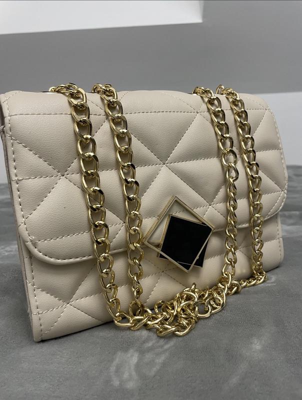 Це сумка-клатч Sofia Quilted Flap Bag зі штучної шкіри кремового кольору Матеріал: Сумка виготовлена з натуральної шкіри з тисненням "ромб". Колір та фурнітура: Має білий колір та золотисту фурнітуру. Особливості: Закривається на блискавку під клапаном, який доповнений декоративним металевим елементом. Відділення: Всередині має одне основне відділення та дві невеликі кишені для дрібниць. Ремінець: У комплекті незнімний плечовий ремінець, який є комбінацією металевого ланцюжка та натуральної шкіри. Розмір: Має малий розмір, приблизно 19 х 14 х 8 см.