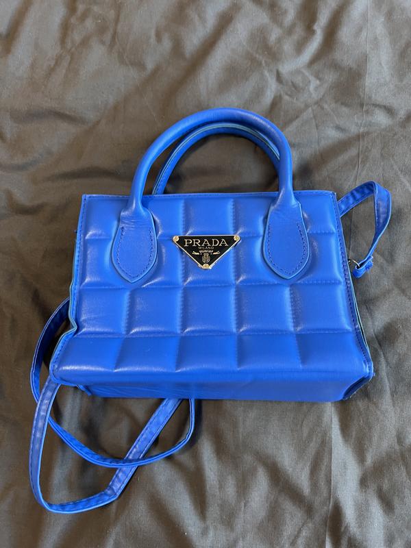 Нова! стьобана сумка яскравого синього кольору з ручками та довгим ремінцем через плече. Вона має характерну трикутну металеву емблему з логотипом Prada на передній частині.