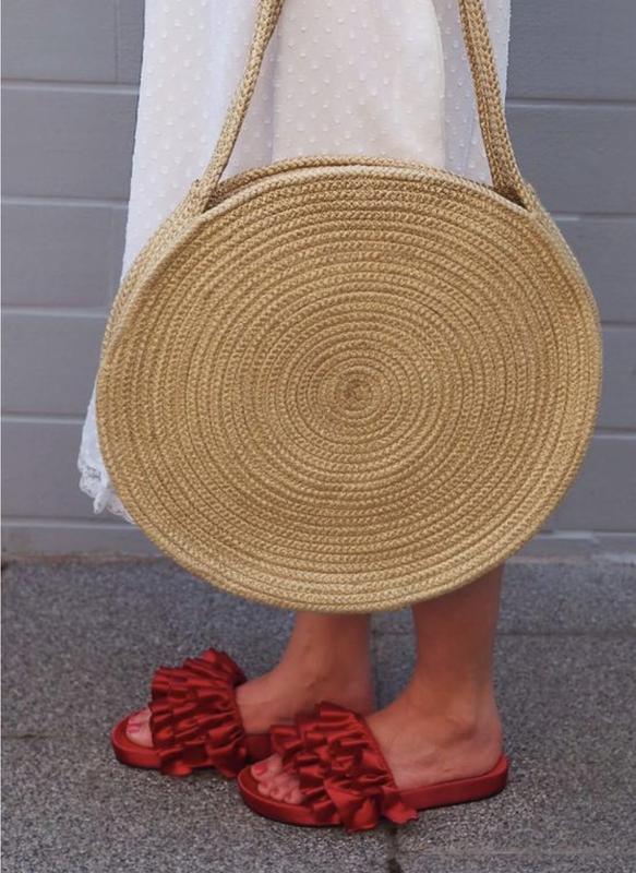 Сумка в стилі бохо має круглу форму та виготовлена з натурального джуту. Стан нової Дуже вмістка, цупкі ручки діаметр сумки 36 см глибина (дно) 6 см довжина ручок 65 см висота ручок над сумкою 27 см