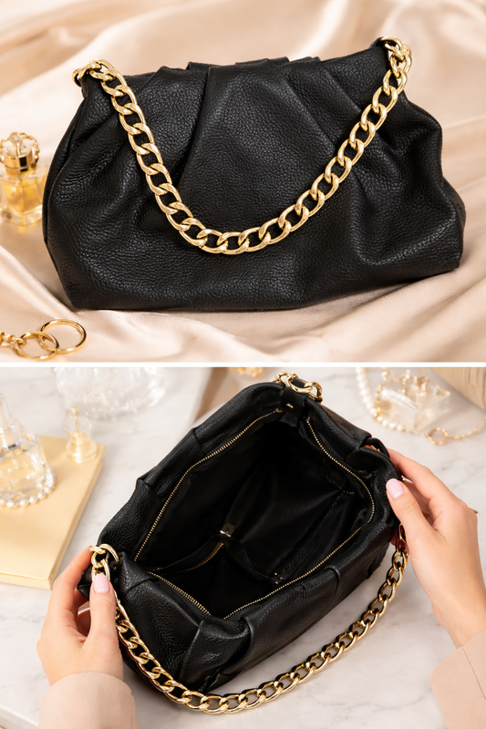 Вещь из собственного гардероба. НЕ СЕКОНД. Купилась в дорогом бутике для себя. Элегантная черная сумка из очень качественной натуральной кожи. Содержимое, удобное и очень стильное. Состояние отличное, без дефектов. Золотистая фурнитура в идеальном состоянии. Следов носки не видно. Отличный вариант для себя или на подарок. Если нужно фото, видео, замеры чипит.