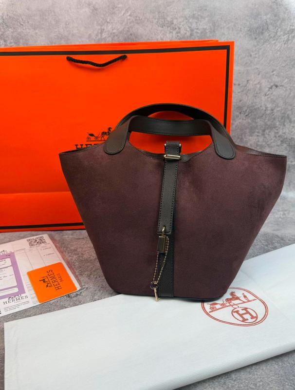 21/34 см Коробка у комплекті Шкіра 🤍 Сумка має підкладки, демонструючи природний вигляд і м'якість матеріалу. Інтер'єр являє собою простий простір у формі відра з відкритим верхом, який затягується шкіряним ремінцем, що кріпиться фірмовим замком, Внутрішній простір, складається з основного великого відділення