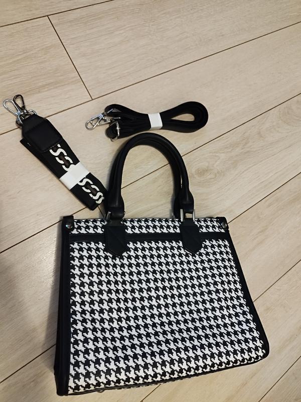 Материал: экокожа, водостойкий. Подкладка: ткань Высота 21 см Ширина 26 см Количество отделений: основной и 2 боковых кармана в середине, в также 1 боковой карман извне. Принт: "гусяча лапка"