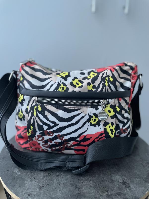 Яскрава новенька сумка з кишенями широким поясом через плече регулюється Є спереду дві кишені на замках і зворотній також кишеня всередині є кишеня на замок Висота 23 см Ширина 33 см Товщина 8 см