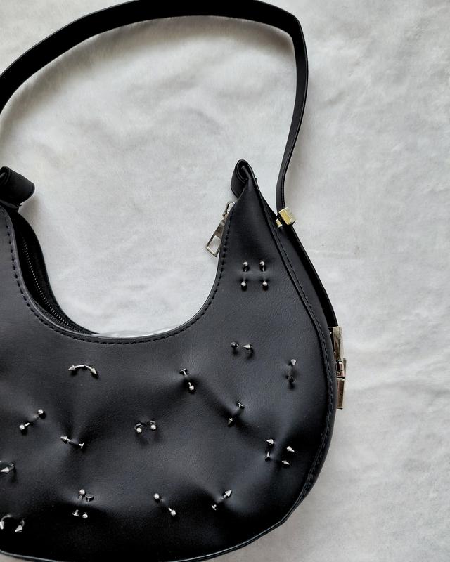 Женская сумка через плечо, хобо сумочка багет в форме полумесяца, маленькая. Имеет одно отделение, ручка может регулироваться Була куплена на aliexpress. Украшена пирсингом САМСТОЙНО. Размеры: 20.5x5.5x20.5 см