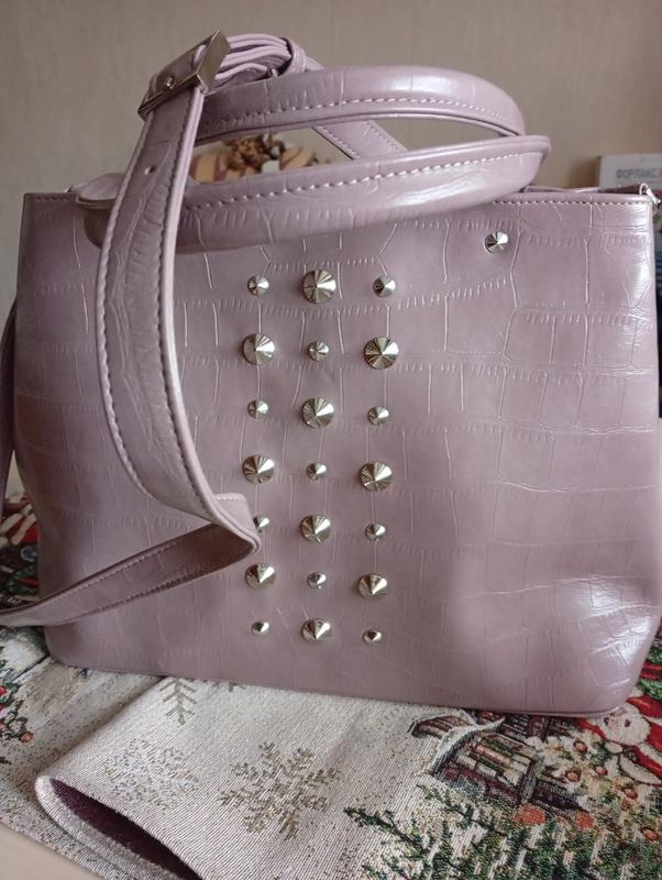 Размер: длина ручки 39 см, ремень на плечо, регулируемый 100 см, сумка на два отделения с тремя карманами, высота сумки 26 см, ширина 36 см, подкладка нежно сиреневого цвета