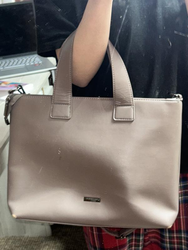 Сумка в кольорі мокко, вмістовна. Є дві маленькі ручкм та олна велика довжину якої можна регулювати. Сумка в хорошому стану, проте на всіх кутиках в низу протерлась