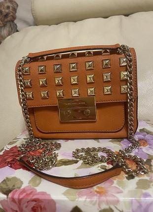 Очень классная сумочка из кожи специальной выделки кораллово-оранжевого цвета, в идеальном состоянии Michael Kors оригинал, заказывали с американского сайта. Размер сумочки 20 • 16 • 6,5 см, внутри много (6 ) отделений , в том числе 2 кармашка на змейках, подкладка с логотипом бренда. Ручки -цепи регулируются, могут быть двойные ( 75 см),либо одна длинная ручка- цепь (135 см). Фурнитура вся качественная, золотого цвета ( цепь, замок, змейки и заклепки). Сумка стильная и харизматичная! В комплекте с сумкой идет пыльник для хранения.