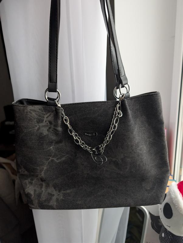 джинсовая сумка, средняя длина ручек, замок внутри не на всю длину, поэтому можно поставить бутылку или стакан, если надо)