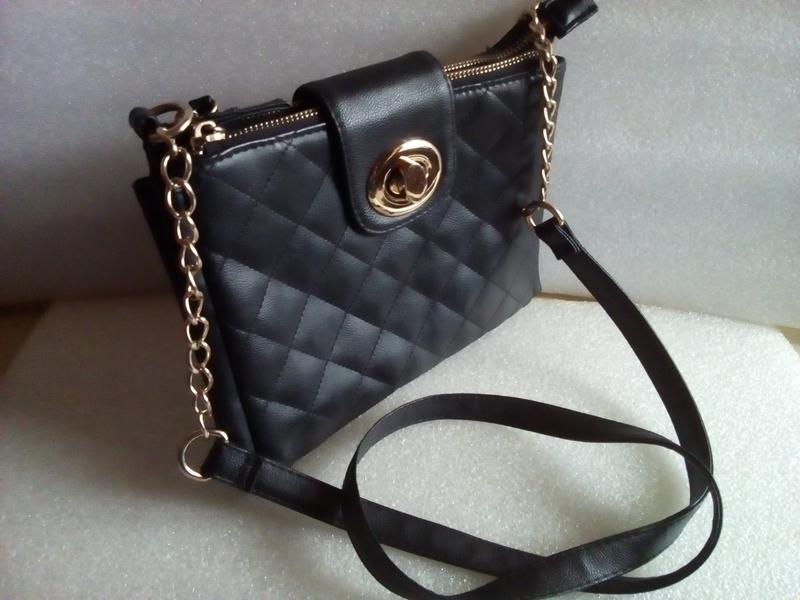 Черная сумочка Atmosphere производства Испании, из эко кожи, в отличном состоянии. Небольшая и удобная, украшенная цепочками, с тремя отделениями, два из которых с прочными змейками. Размеры 23х17см.