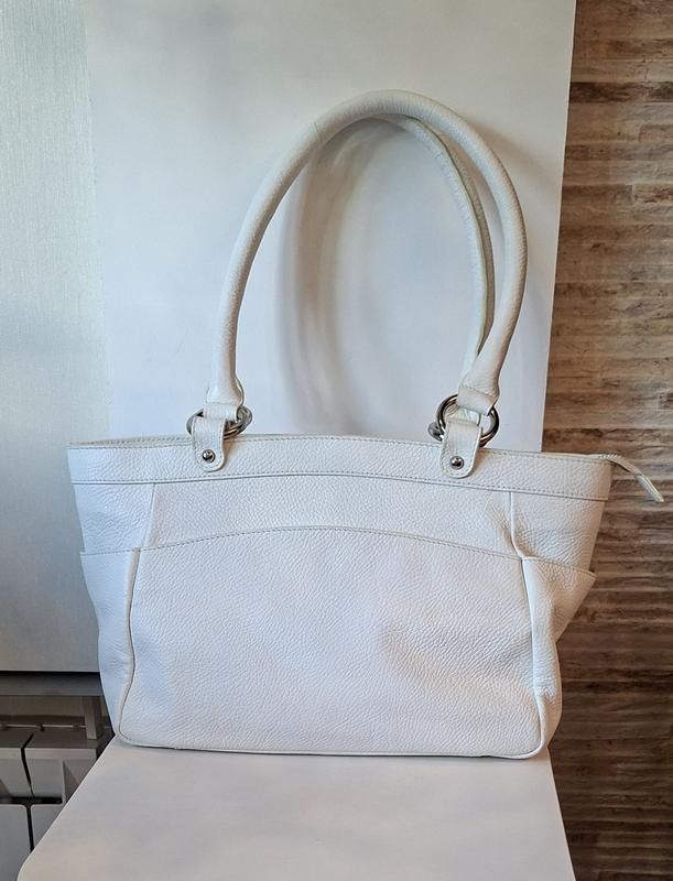 сумка из натуральной кожи белого цвета на двух ручках достаточно большого размера, закрывается на молнию, имеет одно большое отделение с внутренними карманчиками, с лицевой стороны карман на магните и открытые боковые карманы. Размер высота 23см, ширина по верху 40см,дно шириной 13см. длина ручек 59см.