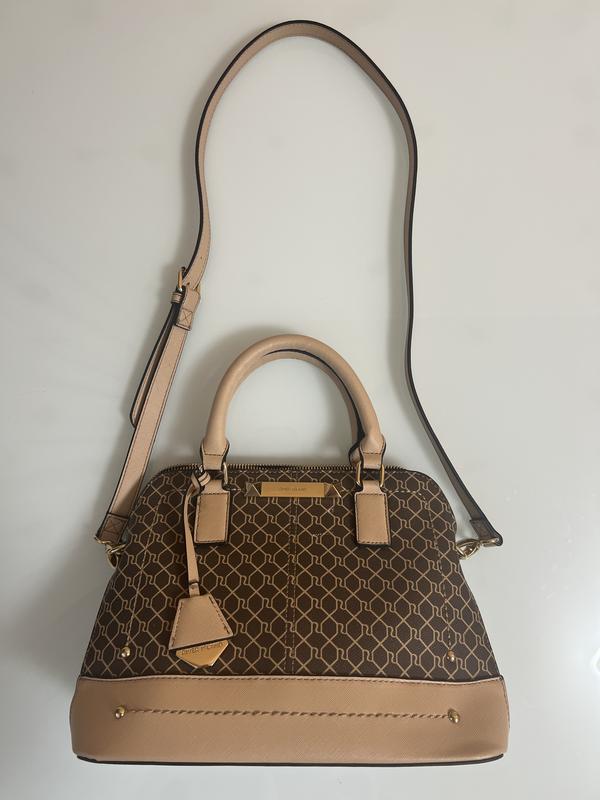 Код: 1373 Жіноча сумка River Island Стильна фірмова сумка від River Island у коричнево-бежевій гамі з фірмовим візерунком. Має короткі ручки та знімний довгий ремінець, можна носити в руці або через плече. Акуратна, містка, тримає форму. Фурнітура золотистого кольору, виглядає охайно та дорого. Висота 22 см, ширина 31-26 см, глибина 14 см Стан: нова, але має на маленькій ручці дефект (на фото видно) Ціна: 700 грн