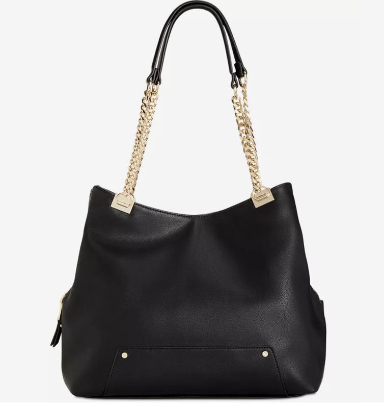 Це сумка-тоут Trippii Chain Tote від бренду I.N.C. International Concepts. Модель виконана у чорному кольорі з ефектним золотистим оздобленням у вигляді ланцюжків на ручках. Характеристики моделі Матеріал: Виготовлена з якісної штучної шкіри (екошкіра). Розміри: Приблизно 35 см у ширину, 29 см у висоту та 13 см у глибину. Дизайн: Має м'яку структуру, магнітну застібку та золотисту фурнітуру, що додає аксесуару елегантності. Функціональність: Досить містка модель, яка підійде як для повсякденного використання, так і для офісу. ********* ********* Бренд I.N.C. International Concepts є ексклюзивною торговою маркою американської мережі універмагів Macy's. На сумці також помітна оригінальна бірка бренду з написом "I·N·C International Concepts"
