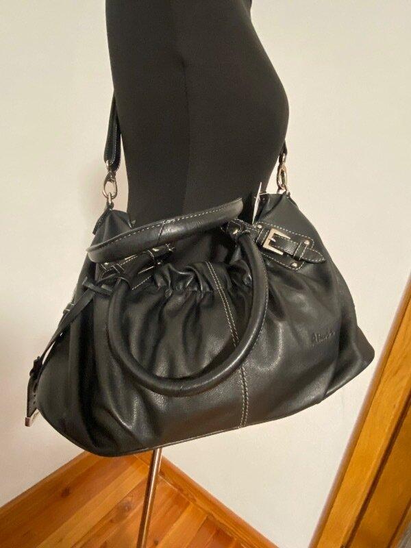 Сумка из натуральной мягкой кожи. Внутри подкладка цветочная, там есть замочек чтобы увидеть кожу с изнанки, есть кошелек и карабин для ключей. Длинная ручка и две короткие. Размер : 43•22•10см, длина ремешка - 145 см мах, ручки - 52 см.