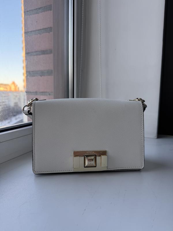 Сумка Furla Mimi у розмірі Mini. У білому кольорі, має потертості на фурнітурі, які, на жаль, вже не усунути. Ціна договірна. 24 х 16 х 8 см 100% шкіра Закривається клапаном на засувку Колір фурнітури: золотистий Має незнімний плечовий ремінь Всередині: 1 відділення, в якому є додаткова кишеня Зовні: кишеня на задній стінці Висота ручки: 15-56 см Комплектується фірмовим: пиловиком, книгою з догляду і биркою FURLA