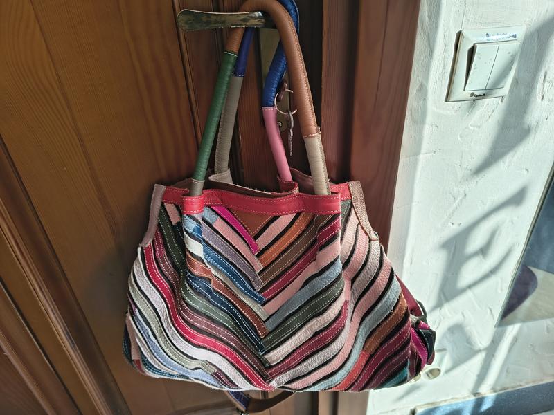 Большая сумка в стиле бохо. Разноцветные полоски из натуральной кожи нашиты на текстильную основу. Состояние идеальное, без нюансов и дефектов. Смотрите другие мои предложения.