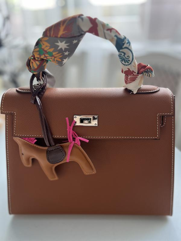 Стильна сумка Hermès Kelly у класичному карамельному (cognac) кольорі. В користуванні не була Виконана з фактурної шкіри (ймовірно Epsom), яка добре тримає форму та стійка до подряпин. Срібляста фурнітура, фірмовий поворотний замок. Ручка декорована яскравою твіллі-хустинкою Hermès та підвіскою у вигляді конячки — витончений акцент, що додає індивідуальності. Всередині тиснення Hermès Paris Made in France. Сумка має жорстку форму, ідеально підходить як для щоденного образу, так і для особливих подій.