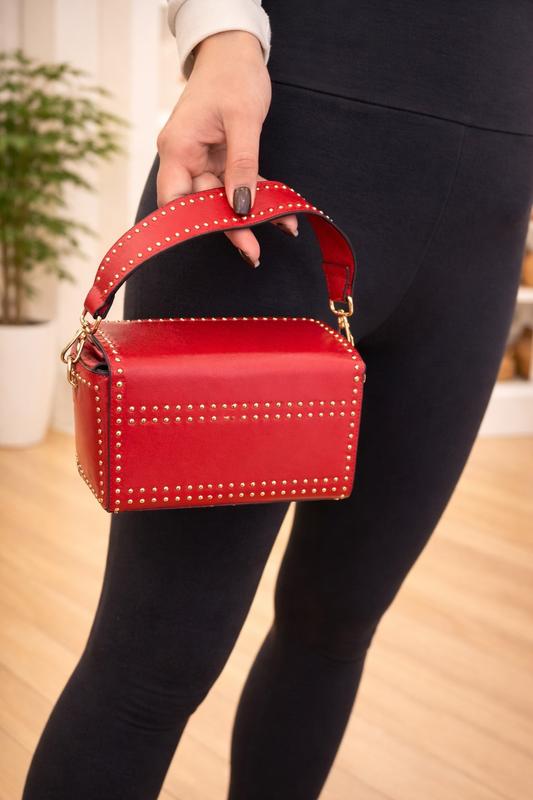 Червона сумка, яка притягує погляди ✨ Ефектна червона сумочка з золотими заклепками — ідеальний акцент для образу 💃 Компактна, але дуже містка: ▫️ одне основне відділення ▫️ внутрішня кишеня на блискавці ▫️ зручна форма, що тримає силует ▫️ якісна фурнітура в золотому кольорі Всередині акуратна чорна підкладка — виглядає дорого та охайно. Коротка ручка + кріплення для ремінця — можна носити в руці або на плечі. Підійде як до базового чорного образу, так і до святкового луку ❤️