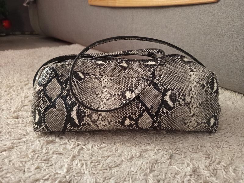 Аккуратная, стильная сумка змеиный принт. 30 см завширшки. 12 см высота. 10 см толщина. Удобная ручка на плечо. Один отдел закрывается на молнию и один карман внутри, также на молнии. Стан идеален. Материал кожзаменитель.