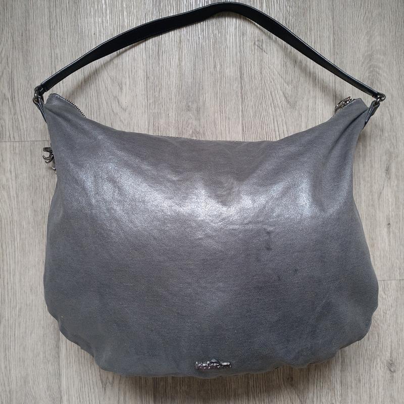 Kipring.Сумка вместительная об *, кожаная с серебристым напылением. Размер 43см*34см, ручка 53см(не регулируется) Есть нюансы, в виде микротрещенок на ручке, на коже несколько типа затяжек (см.фото) Подкладка коричневая, без дефектов. Все молнии рабочие.