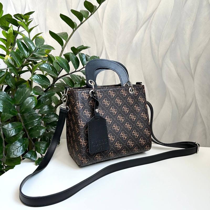 #guess Код: 0150 Ціна 920 грн. Розміри: Висота- 18 см. Ширина - 19 см. Дно- 11 см. Довгий ремінець, що регулюється. Матеріал- еко шкіра. Сумочка має одне відділення. Всередині дві відкриті кишені та одна на блискавці.