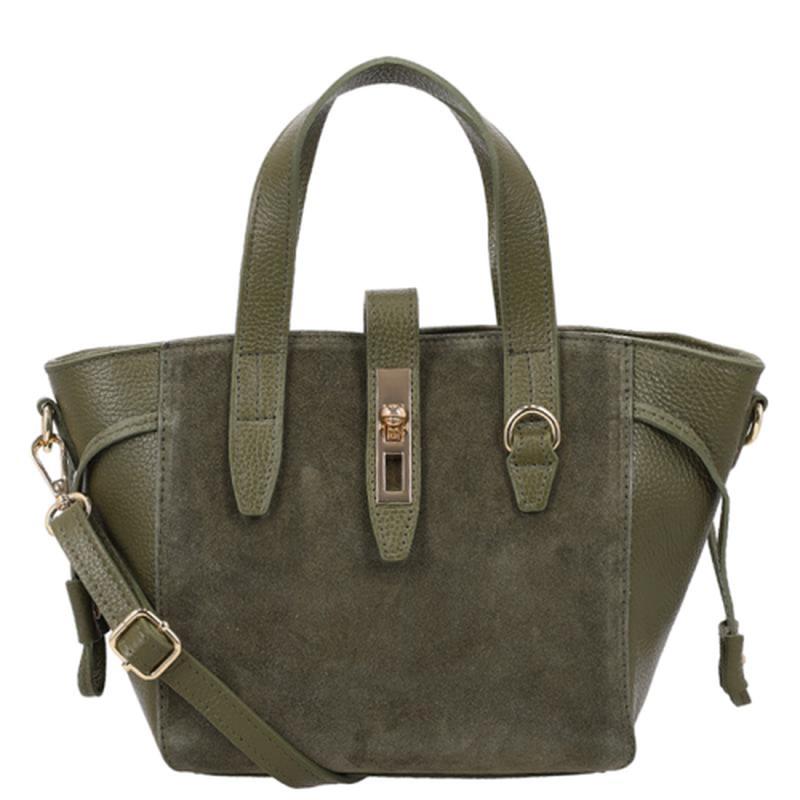 В наяности сумка кожаная цвета хаки из комбинированных натуральной зернистой кожи и замши производства Италии. Длина -32см/22см Высота-17см Глубина-12см Длина каждой из 2х коротких ручек-32см Длина длинной плечевой ручки,щр отстегивается-135см. Внутри вместительная,также есть 2 небольших боковых кармана под разные мелочи. Страна производитель-Италия.