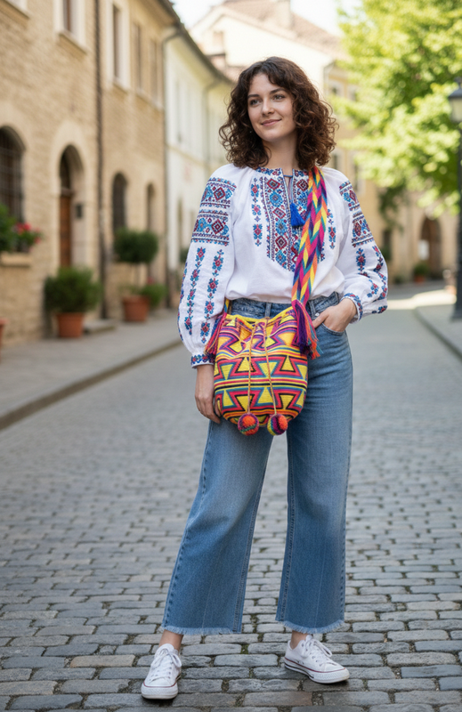 Сумка-мешок с круглым дном и затяжкой. Материал: Плотная хлопковая пряжа. Орнамент: яркий геометрический узор в стиле этно. Использованы контрастные треугольники и зигзаги, создающие динамичный визуальный эффект. Сочетание насыщенных, теплых цветов, перекликающихся с украинской вышивкой: Доминирующие цвета: Солнечно-желтый и ярко-розовый (фуксия).Бирюзовый, темно-синий и фиолетовый, которые добавляют глубины рисунку.Широкий плетеный пасок через плечо. Он имеет собственный уникальный узор в виде цветных ромбиков и завершается игривыми кисточками. Застежка: плетеный шнурок-затяжка, украшенный двумя большими объемными помпонами (помпоны повторяют цвета самой сумки).Дно: Плоская, круглой формы, что позволяет сумке держать форму и быть достаточно вместительной.