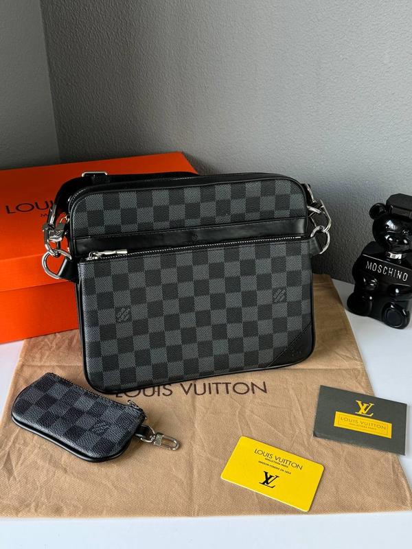Чоловічий месенджер тріо Louis Vuitton 📌Розмір: 25.5х19х7 см 📌Матеріал: натуральна італійська шкіра + металева фурнітура 📌Колір: сіро-чорна шахматка Ціна: 2450 грн Сумка виготовлена з італійської натуральної шкіри. Має одне основне велике відділення. Є шкіряна нашивка з фірмовим написом бренду та кишеня на стінці. Месенджер має додатковий клатч на блискавці спереду змінний та ключницю для навушників або інших невеликих речей. Фурнітура металева та брендована чорного кольору. Ремінець текстильний з фірмовим написом бренду, має регулюєму довжину до 120 см. 📌Комплектація: брендова коробка Louis Vuitton