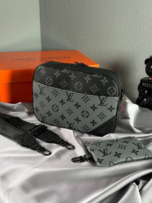 Чоловічий месенджер Louis Vuitton 📌Розмір 22х16х5 см 📌Матеріал: еко-шкіра, металева фурнітура 📌Колір: сіро-чорний monogram 💰Ціна: 1750 грн Сумка виготовлена з люкс еко шкіри. Має основний на блискавці відділ, всередині є шкіряна нашивка з брендовим тисненням та додаткові кишеньки на стінці. На лицьовій сторонці є відкрита кишеня. Сумка має у комплекті ключницю на ремені під її дизайн для навушників, монет або інших дрібниць. Фурнітура металева та брендована чорного кольору. Ремінець текстильний з фірмовим написом бренду, має регулюєму довжину до 120 см. 📌Комплектація: брендова коробка Louis Vuitton