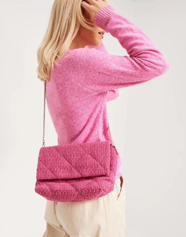 Твідова сумка рожевого кольору. Ремінець комбінований: сріблястий металевий ланцюжок із рожевою вставкою для зручності на плечі.