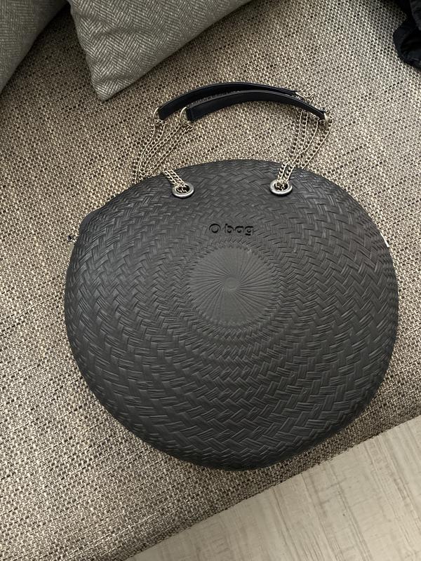 Сумка конструктор кругла . На плече . Діаметр 42. Матеріал зовні чорного кольору. Ручки зйомні на ланцюжку шкіряні сині. Підкладка текстильна чорно синя , теж зйомка з карманом на змійці