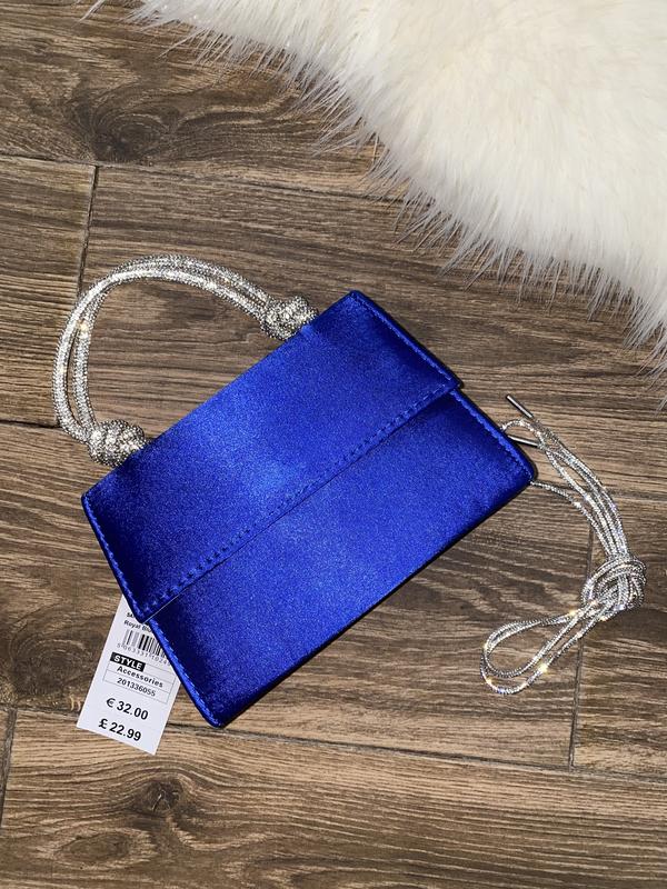 Сатиновая синяя сумка с декоративной ручкой от QUIZ В комплекте длинная ручка на плечо Основной материал :97% полиэстер 3% эластан Подкладка : 100% полиэстер Новая, с этикеткой дам аксессуар, ремень с камнями как на ручке)