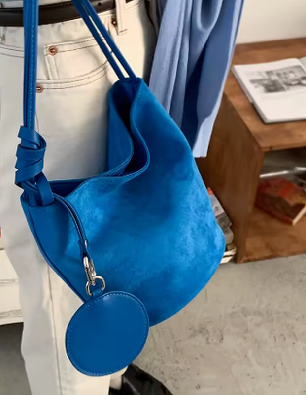 Сумка-видро из искусственной замши хорошего качества василькового цвета. Две ручки из искусственной кожи длиной по 50 см. Съемный декоративный элемент - брелок. Застегивается на скрытый магнит. Внутри черная подкладка, стандартные боковые карманы. Размер 25х19х17 см, вес 290 г.