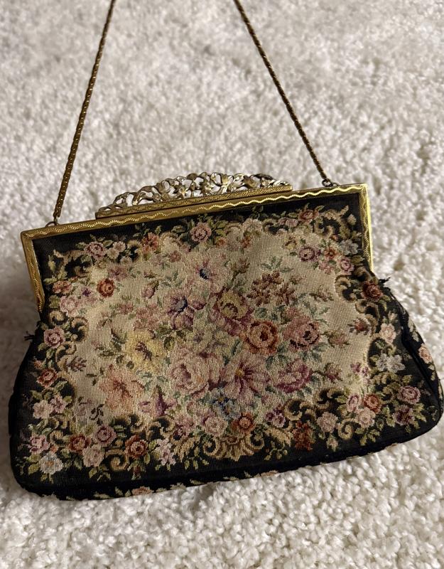 Це витончений зразок вінтажної театральної сумочки, виконаної в техніці petit point (дрібна вишивка гобеленовим швом). Такі аксесуари були надзвичайно популярними у першій половині XX століття, зокрема в Австрії та Німеччині. Довжина-21 Висота-13 Дно-2.5 Цепочка-31