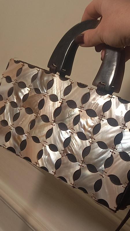 очень красивая винтажная сумка из натурального перламутра, ручки рог, длинный ремень кожа,сумочка выглядит невероятно, размер 25/14/7см,стан очень красивая, редкая вещь, также смотрите другие мне товары, есть много интересного.