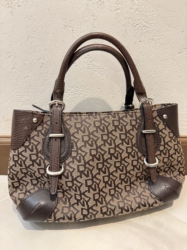 Стильна, брендова сумка DKNY. Має три відділення, два відкриті і одне на змійці, кишеньку на змійці і дві відкриті кишеньки.Шкіра і текстиль. Ширина-31 Висота-16 Дно-9