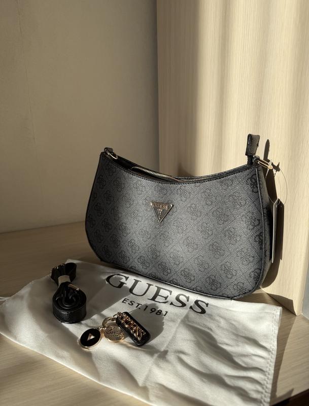 Нова сумка Guess з брендованою монограмою та біркою, підійде на подарунок Оригінал, привезено з Європи. В комплекті йде пильник та брелок Матеріал: PU шкіра, 29×6×18 см