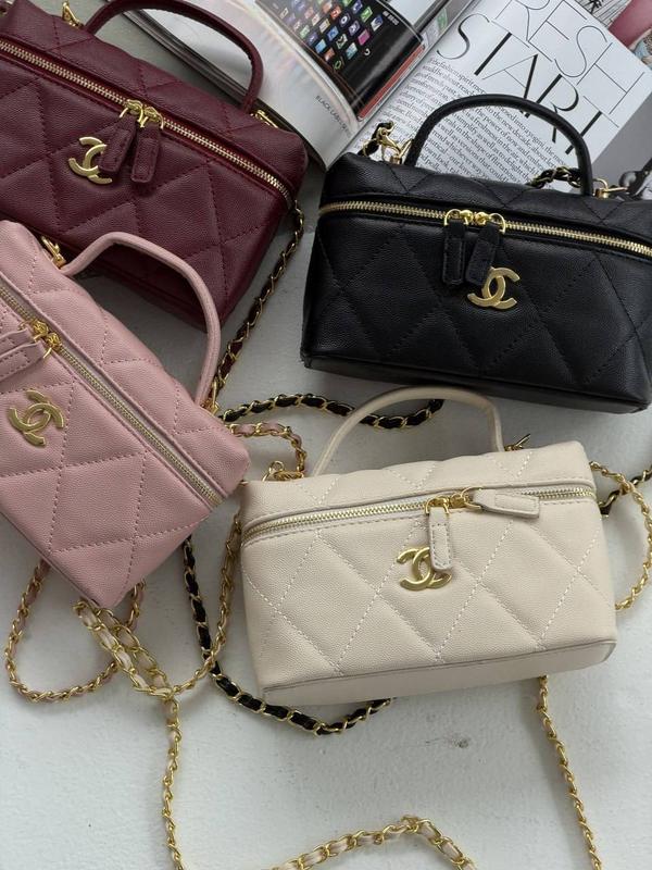 Сумка Chanel Vanity with Chain Колір: чорний, білий, пудровий, бордовий Витончена прострочена сумочка з одним основним відділенням. Усередині — брендована підкладка, фірмовий логотип і бірка з QR-кодом. Для носіння через плече передбачений тонкий довгий ланцюжок із вплетеною екошкірою. Завдяки спеціальному механізму ремінець регулюється за довжиною та за потреби знімається Розмір: 19 × 12 × 5,5 см Матеріал: екошкіра Максимальна довжина ланцюжка — 116 см Пильник в комплекті